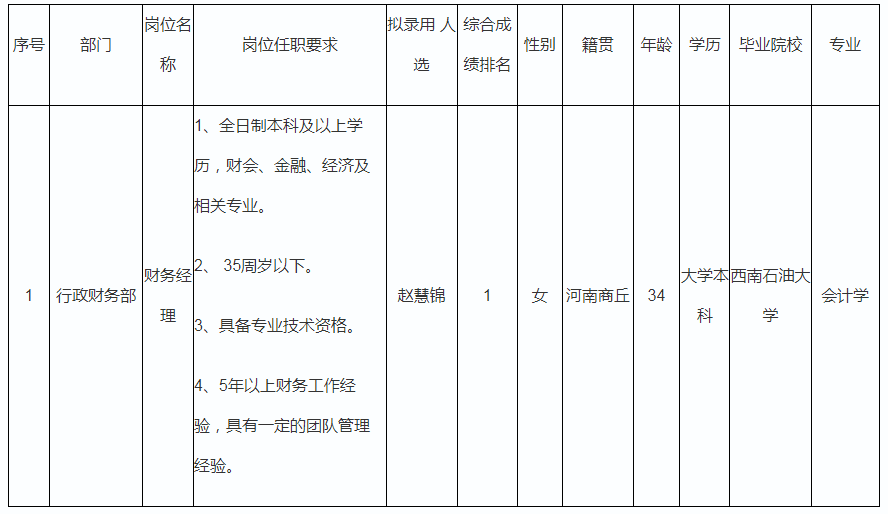 根據(jù)成都長(zhǎng)虹融資租賃有限責(zé)任公司發(fā)布的招聘公告及招聘相關(guān)規(guī)定,經(jīng)面試、考察、體檢等程序,擬錄用趙慧錦同志到成都長(zhǎng)虹融資租賃有限責(zé)任公司工作,現(xiàn)予以公示,具體情況如下:
