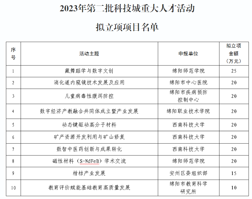 根據(jù)《綿陽市加快集聚創(chuàng)新人才十條政策措施(暫行)》(綿委人才組〔2022〕2號)等政策規(guī)定,經(jīng)評審,2023年第二批科技城重大人才活動擬立項項目10個,擬立項金額190萬元,現(xiàn)予以公示,時間為5個工作日,自11月9日—11月15日。