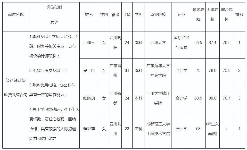 根據(jù)綿陽富達資產(chǎn)經(jīng)營有限責(zé)任公司發(fā)布的招聘公告及招聘相關(guān)規(guī)定,經(jīng)筆試、面試等程序,現(xiàn)將筆試(面試)成績予以公示。