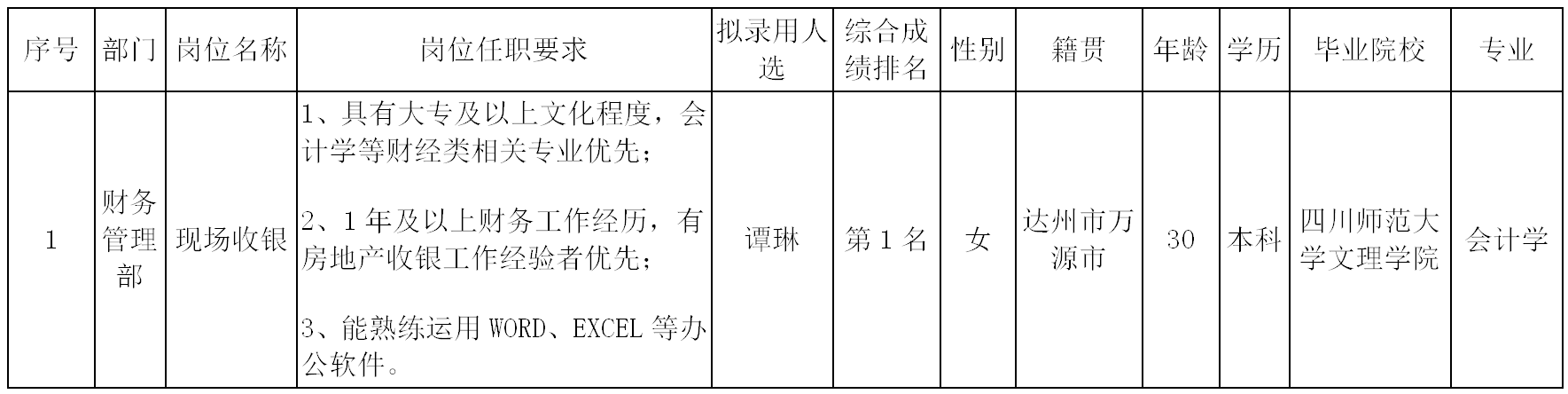 根據(jù)四川長虹置業(yè)有限公司發(fā)布的招聘公告及招聘相關(guān)規(guī)定,經(jīng)筆試、面試、考察、體檢等程序,擬錄用譚琳同志到四川長虹置業(yè)有限公司工作,現(xiàn)予以公示,具體情況如下: