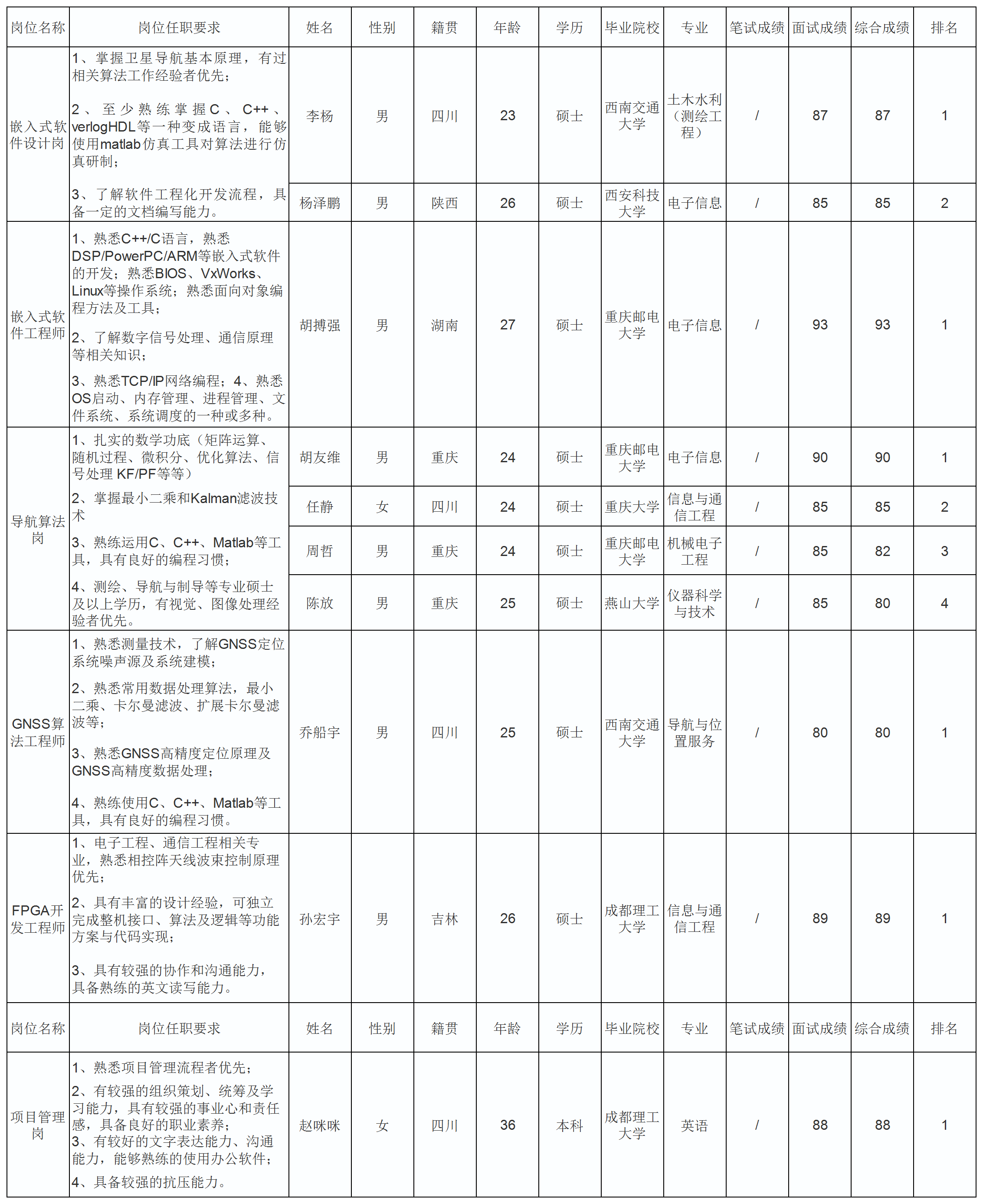 根據(jù)重慶九洲星熠導(dǎo)航設(shè)備有限公司發(fā)布的招聘公告及招聘相關(guān)規(guī)定,經(jīng)面試等程序,現(xiàn)將面試成績(jī)予以公示: