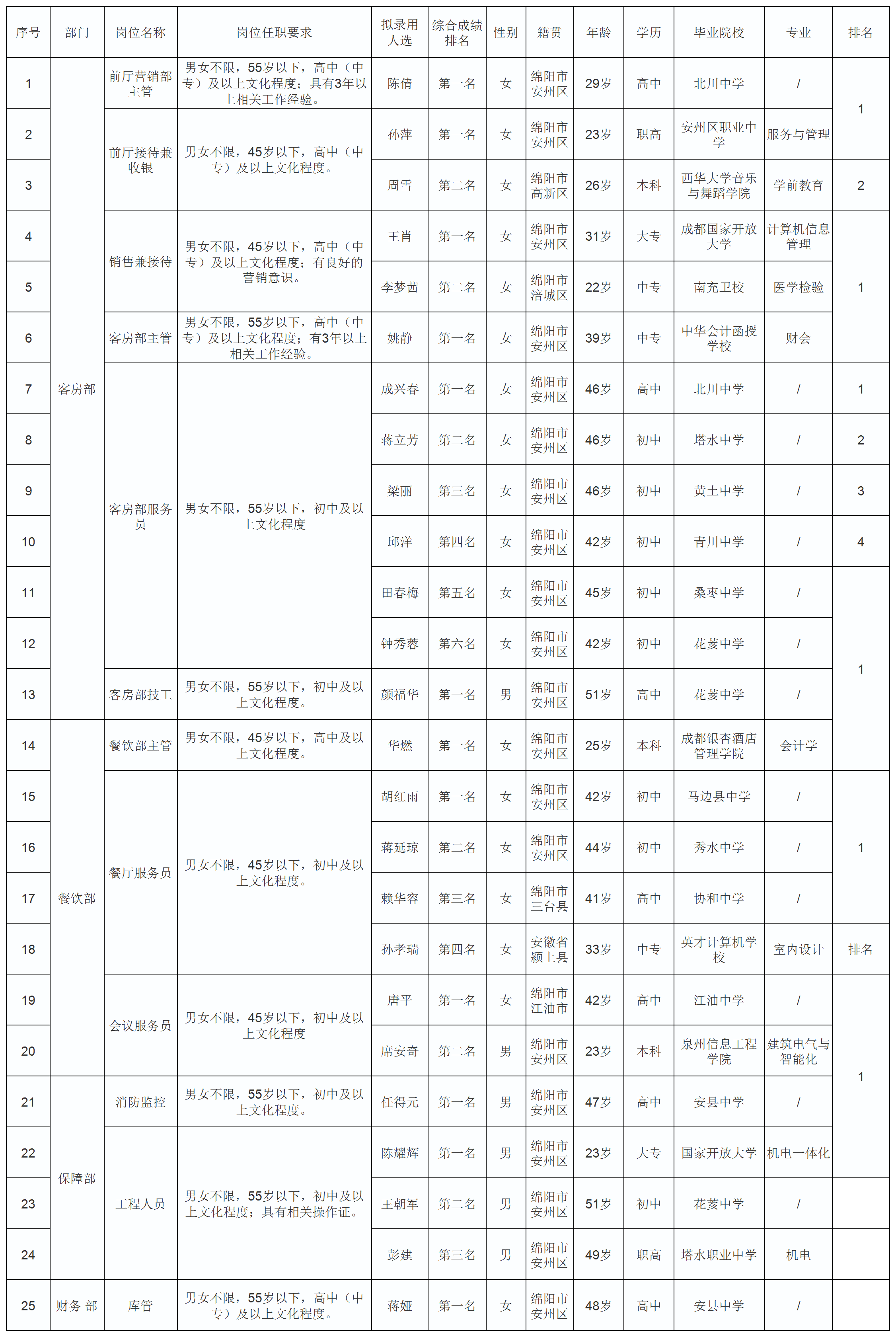 根據(jù)綿陽市綿州嘉來會務服務有限公司發(fā)布的招聘公告及招聘相關(guān)規(guī)定,經(jīng)面試、體檢等程序,擬錄用以下人員到客房部、餐飲部等部門工作,現(xiàn)予以公示,具體情況如下: