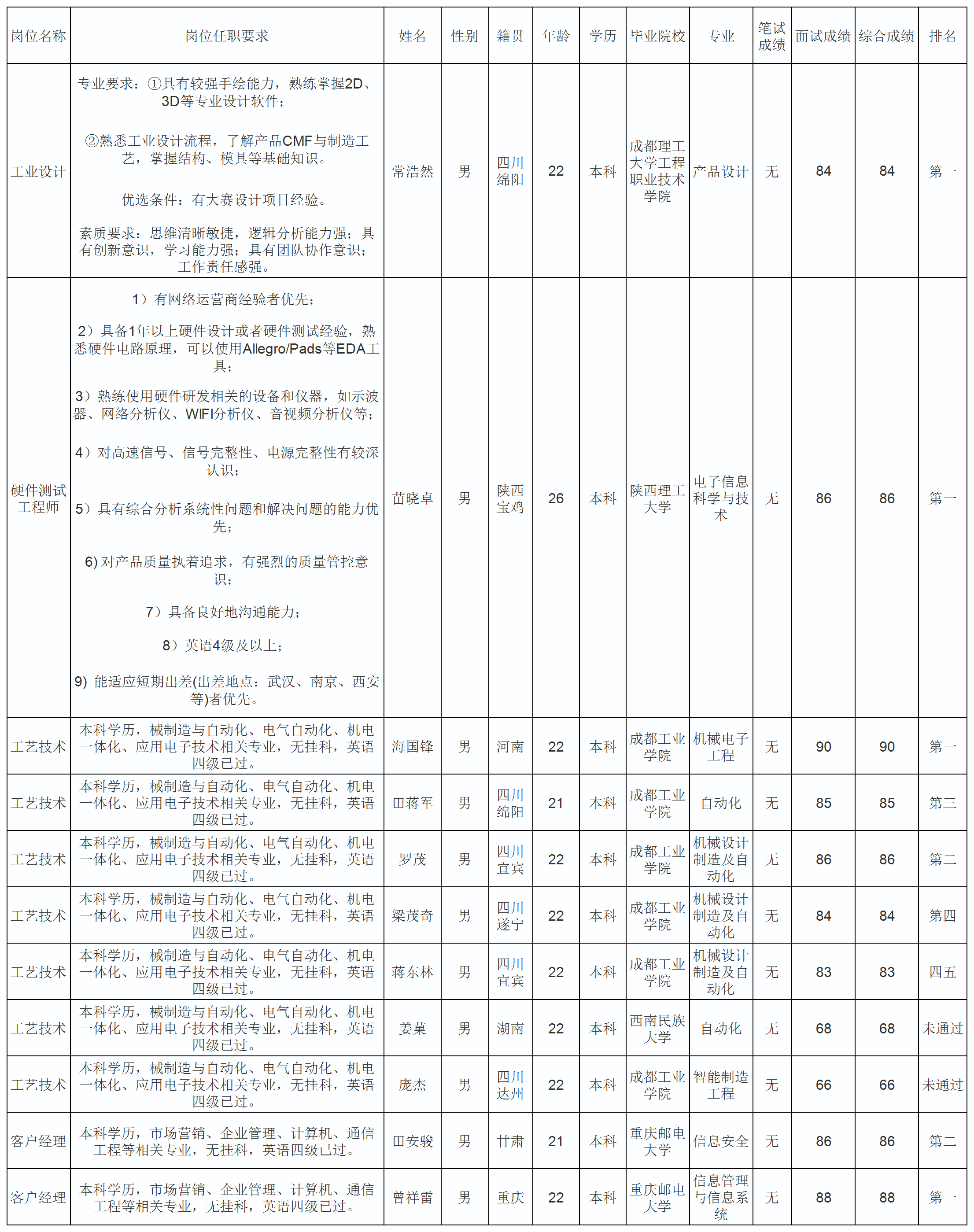 根據(jù)四川九州電子科技股份有限公司發(fā)布的招聘公告及招聘相關(guān)規(guī)定,經(jīng)筆試、面試等程序,現(xiàn)將筆試(面試)成績予以公示。