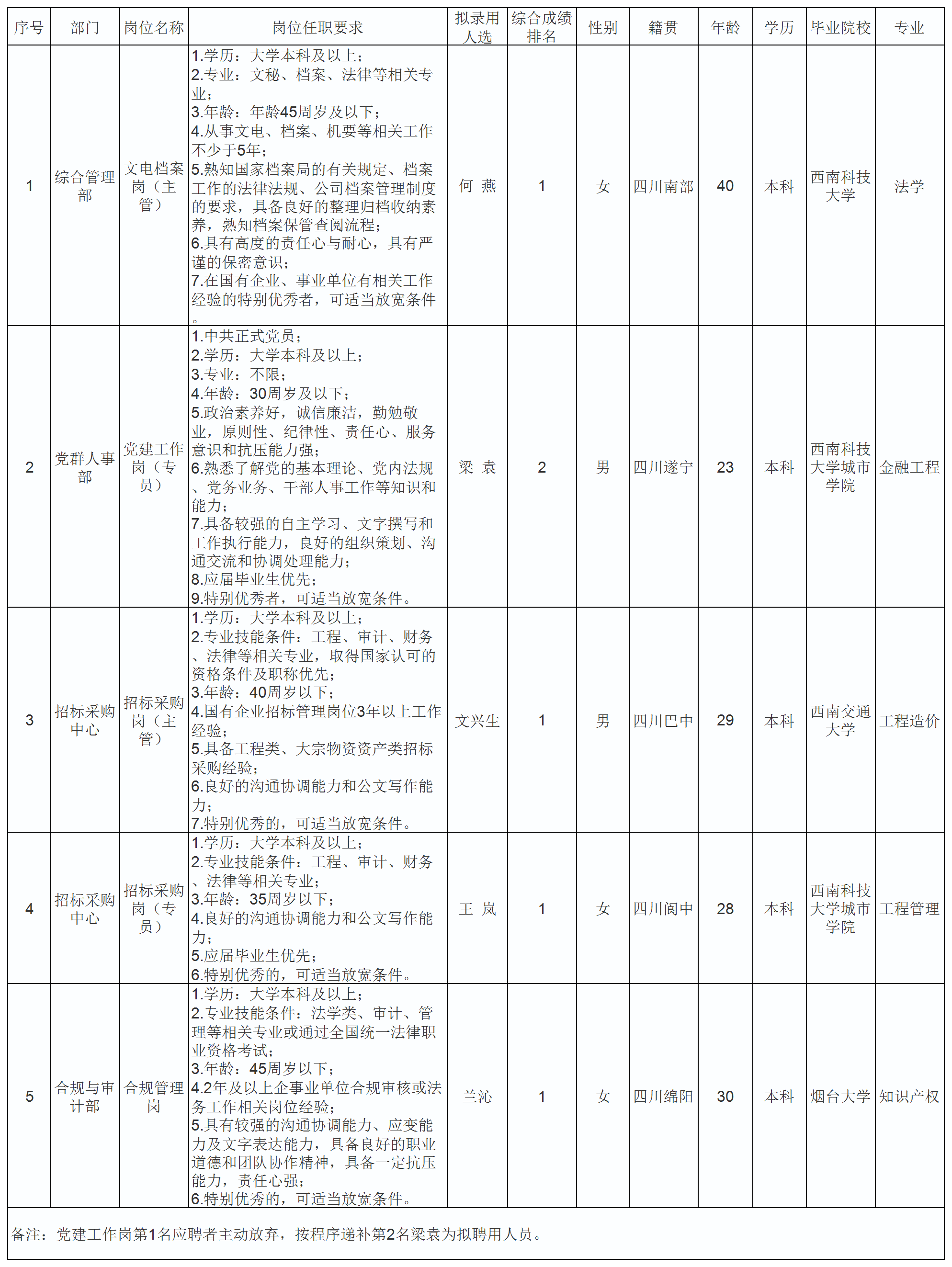 根據(jù)綿陽交通發(fā)展集團(tuán)有限責(zé)任公司發(fā)布的招聘公告及招聘相關(guān)規(guī)定,經(jīng)筆試、面試、體檢、背景調(diào)查等程序,擬錄用何燕等5名同志到交發(fā)集團(tuán)工作,現(xiàn)予以公示,具體情況如下: