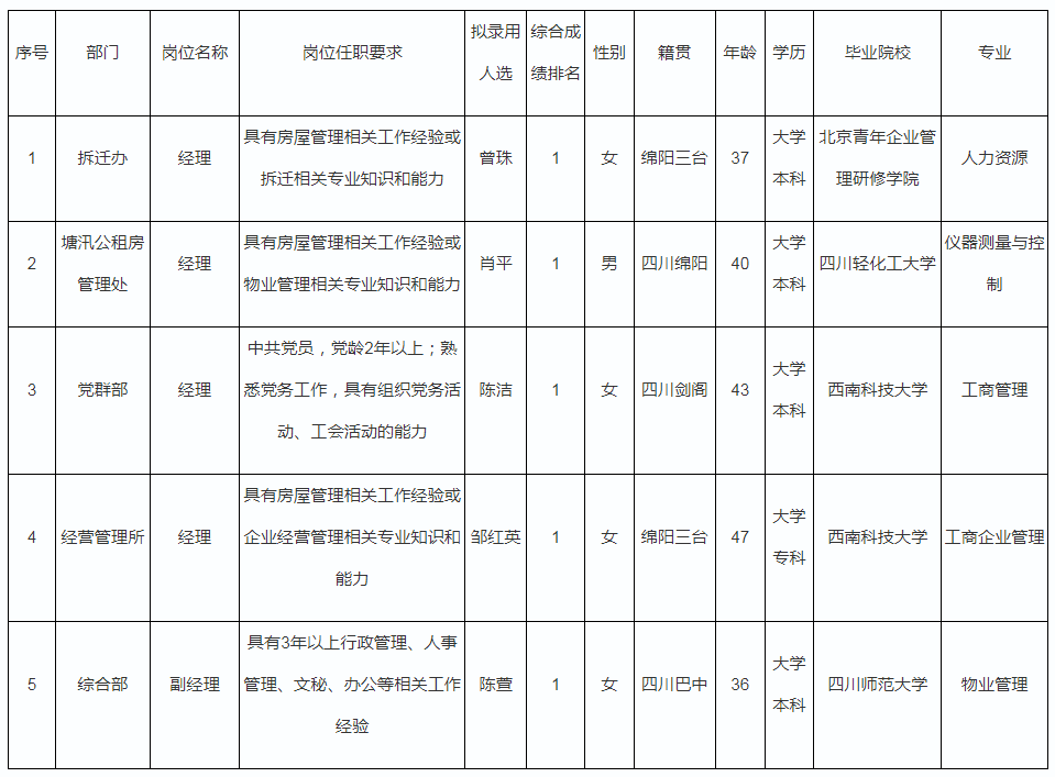 根據(jù)綿陽市康居房產(chǎn)經(jīng)營管理有限公司發(fā)布的康居公司中層管理崗位內(nèi)部競聘的公告和工作方案相關(guān)程序,經(jīng)資格審查、綜合測評、組織考察等程序,擬錄用曾珠為綿陽市康居房產(chǎn)經(jīng)營管理有限公司拆遷辦經(jīng)理、肖平為綿陽市康居房產(chǎn)經(jīng)營管理有限公司塘汛公租房管理處經(jīng)理、陳潔為綿陽市康居房產(chǎn)經(jīng)營管理有限公司黨群部經(jīng)理、鄒紅英為綿陽市康居房產(chǎn)經(jīng)營管理有限公司經(jīng)營管理所經(jīng)理、陳萱同志為綿陽市康居房產(chǎn)經(jīng)營管理有限公司綜合部副經(jīng)理,現(xiàn)予以公示,具體情況如下: