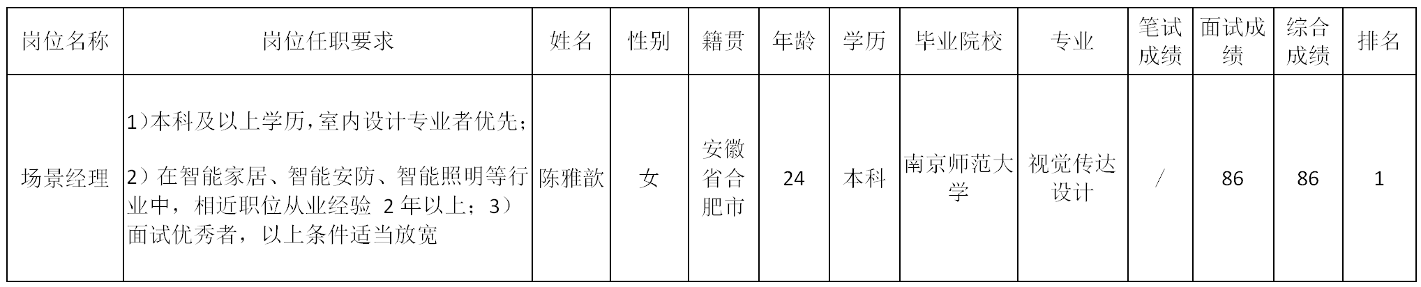 根據(jù)四川虹美智能科技有限公司發(fā)布的招聘公告及招聘相關(guān)規(guī)定,經(jīng)面試等程序,現(xiàn)將面試成績予以公示。
