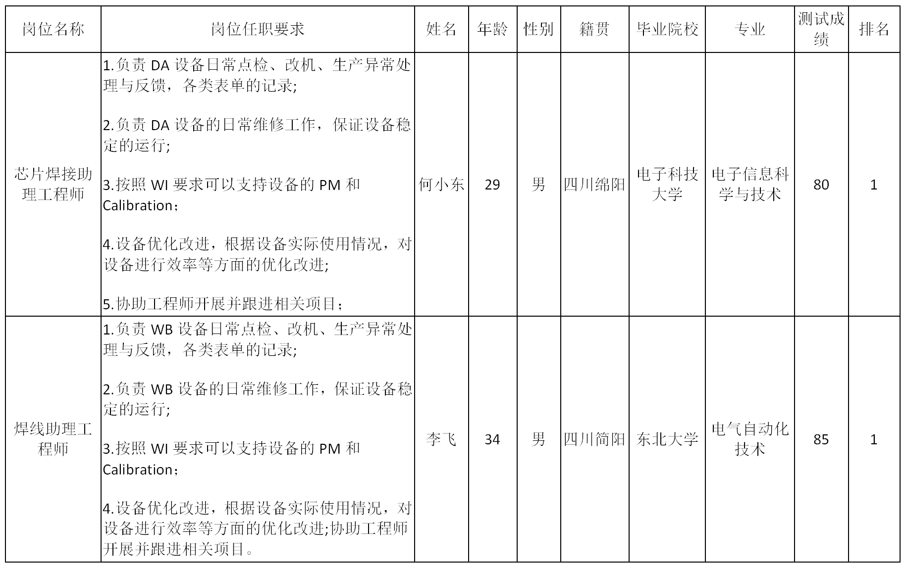 根據(jù)四川啟賽微電子有限公司發(fā)布的招聘公告及招聘相關(guān)規(guī)定,經(jīng)用人單位面試程序,現(xiàn)將測試合格人員予以公示。