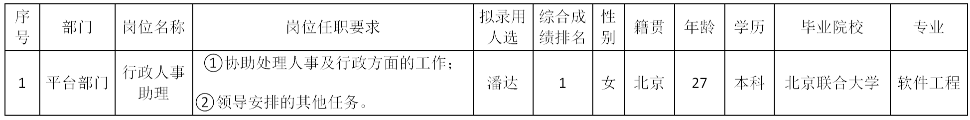 根據(jù)四川長(zhǎng)虹佳華信息產(chǎn)品有限責(zé)任公司發(fā)布的招聘公告及招聘相關(guān)規(guī)定,經(jīng)筆試、面試、考察、體檢等程序,擬錄用潘達(dá)同志到四川長(zhǎng)虹佳華信息產(chǎn)品有限責(zé)任公司工作,現(xiàn)予以公示,具體情況如下: