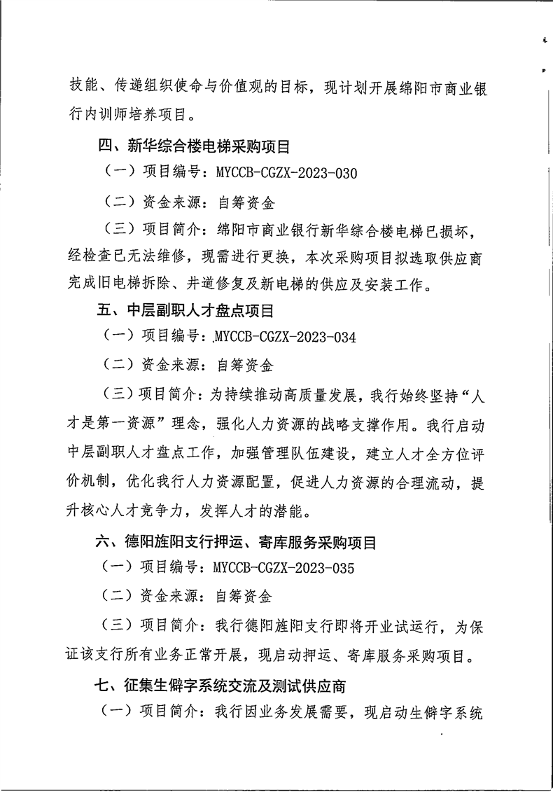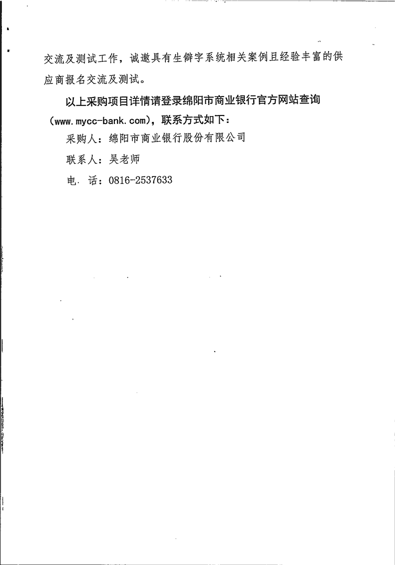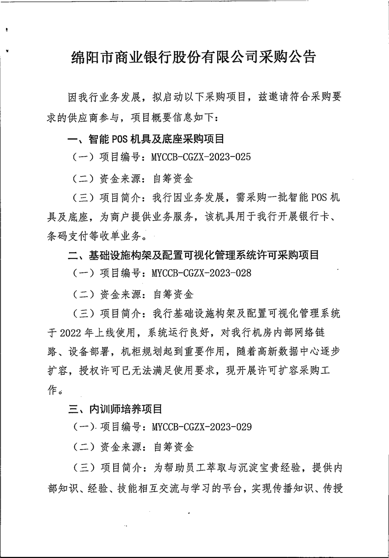 綿陽市商業(yè)銀行股份有限公司采購公告
