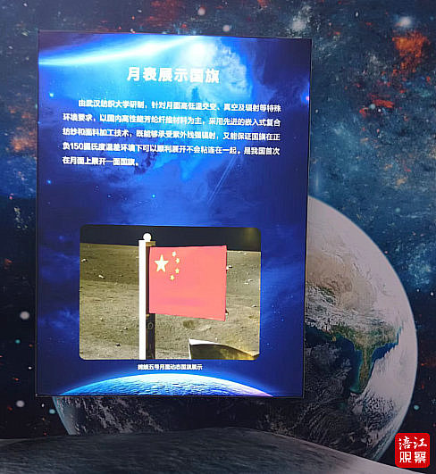 旗開(kāi)月表,五星閃耀。此次在中國(guó)深空探測(cè)工程展位展出的國(guó)旗,是“嫦娥五號(hào)”在月球表面展示過(guò)的國(guó)旗。該面國(guó)旗由武漢紡織大學(xué)研制,針對(duì)月面高低溫交變、真空及輻射等特殊環(huán)境要求,以國(guó)內(nèi)高性能芳綸纖維材料為主,采用先進(jìn)的嵌入式復(fù)合紡紗和面料加工技術(shù),既能夠承受紫外線強(qiáng)輻射,又能保證國(guó)旗在正負(fù)150攝氏度溫差環(huán)境下可以順利展開(kāi)。