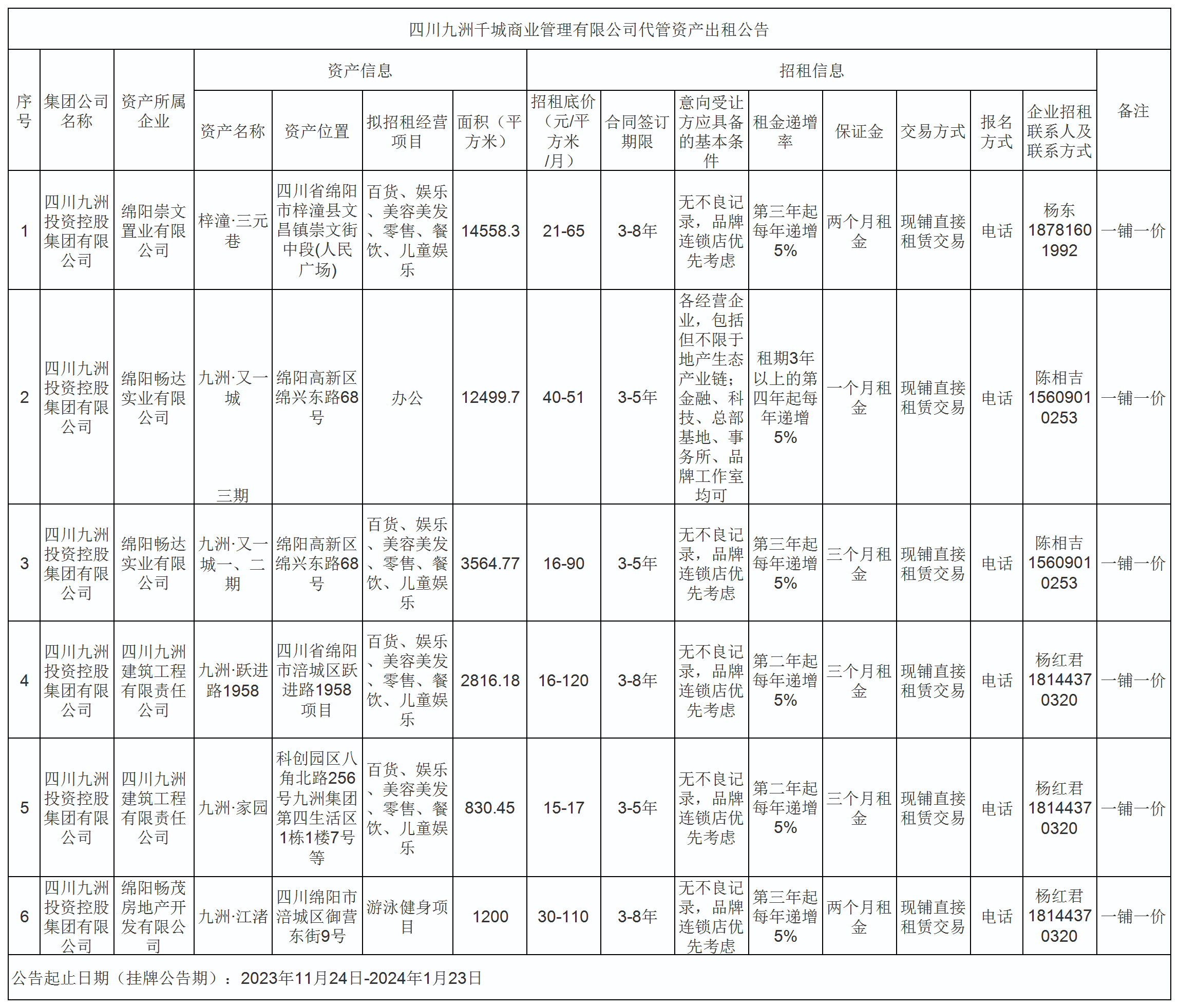 四川九洲千城商業(yè)管理有限公司代管資產出租公告