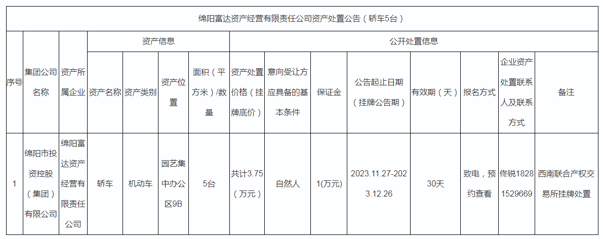 綿陽富達(dá)資產(chǎn)經(jīng)營有限責(zé)任公司資產(chǎn)處置公告