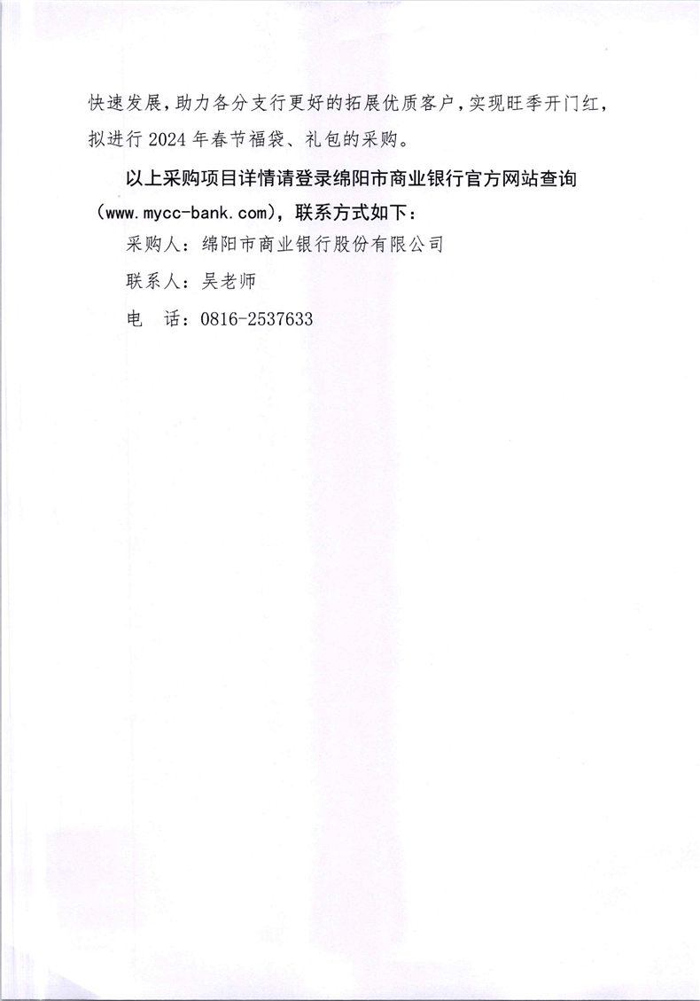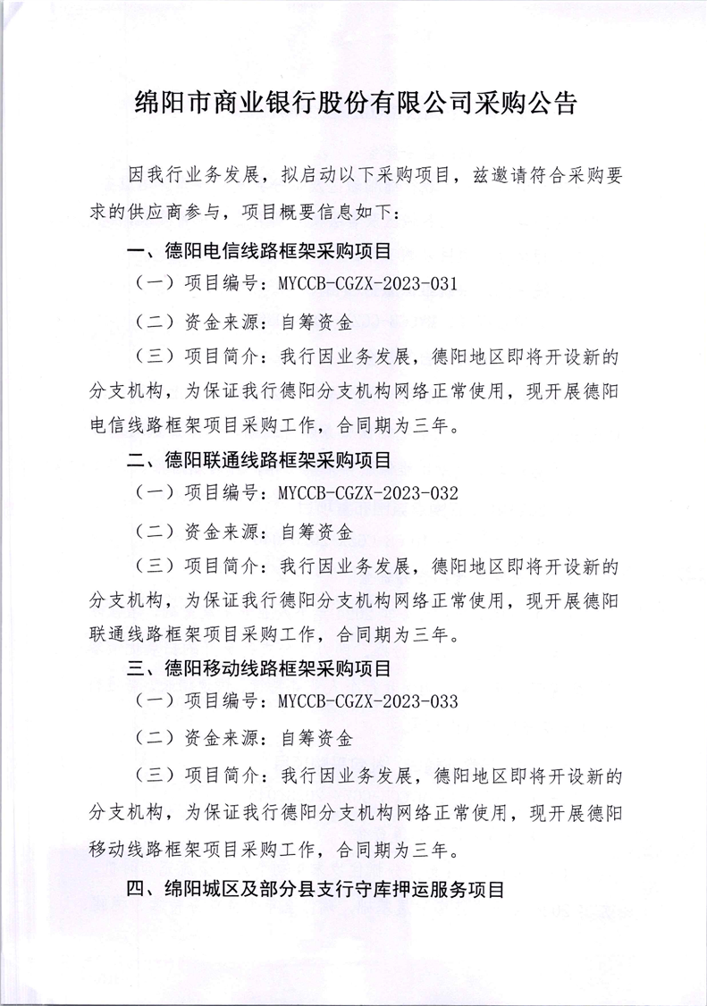 綿陽(yáng)市商業(yè)銀行股份有限公司采購(gòu)公告