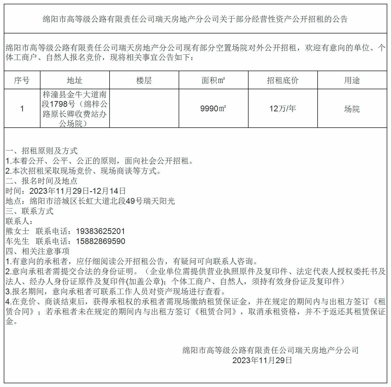 綿陽市高等級(jí)公路有限責(zé)任公司瑞天房地產(chǎn)分公司關(guān)于部分經(jīng)營性資產(chǎn)公開招租的公告