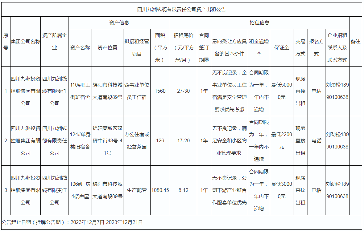 四川九洲線纜有限責任公司資產(chǎn)出租公告