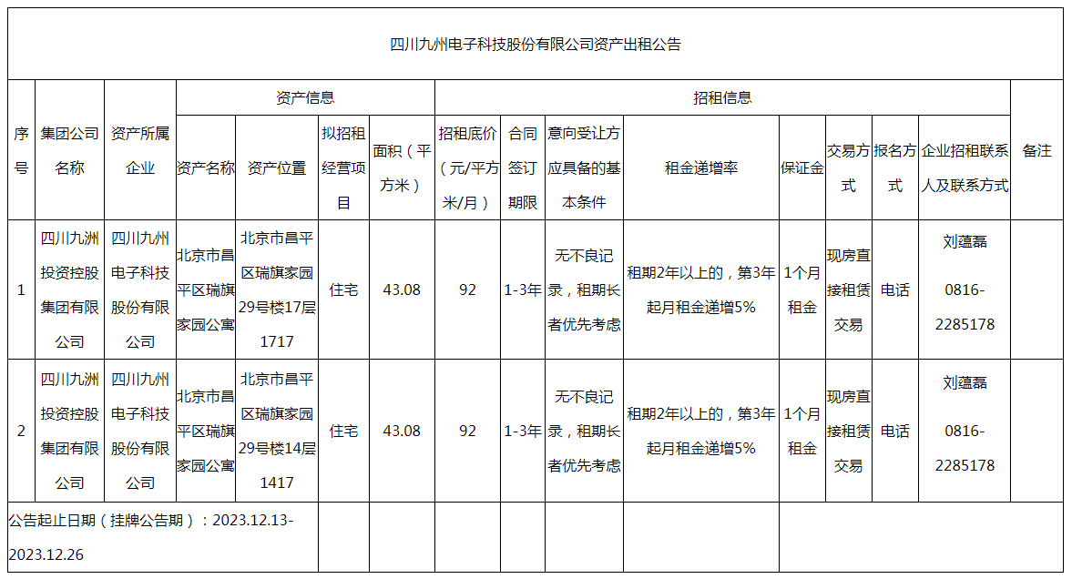 四川九州電子科技股份有限公司資產(chǎn)出租公告