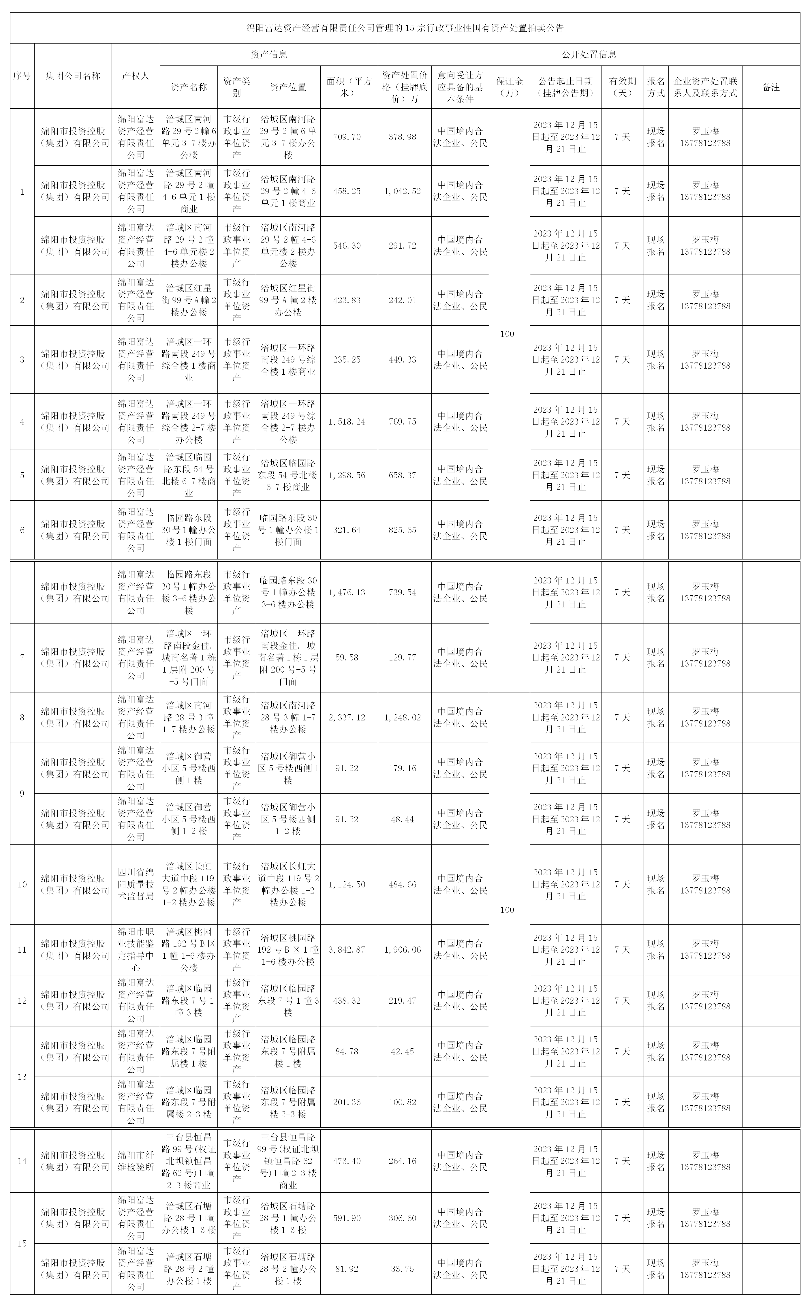 綿陽富達資產經營有限責任公司管理的15宗行政事業(yè)性國有資產處置拍賣公告