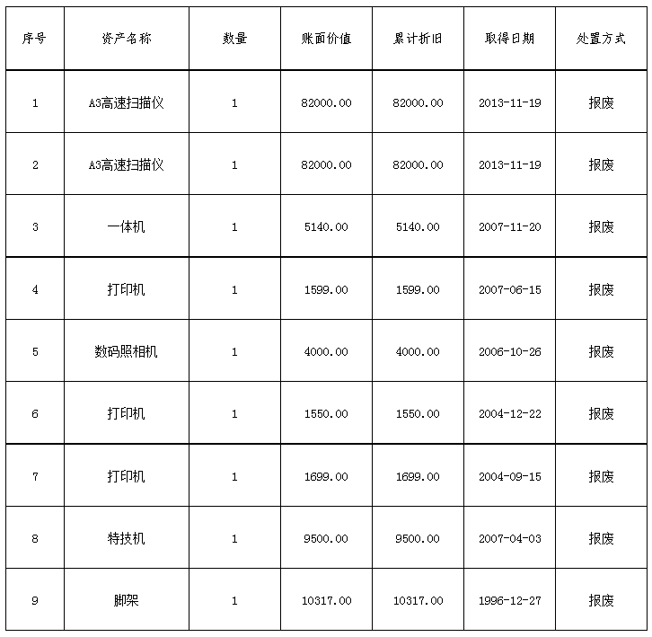 綿陽市城建檔案管理處報廢部分固定資產一批,該批固定資產遠超使用年限,已損毀無法維修,單位決定進行資產報廢處置,處置殘值將按規(guī)定上交。根據《綿陽市人民政府辦公室關于規(guī)范重點領域重要信息公開工作的通知》(綿府辦函〔2023〕91號)要求,現(xiàn)予以公示。