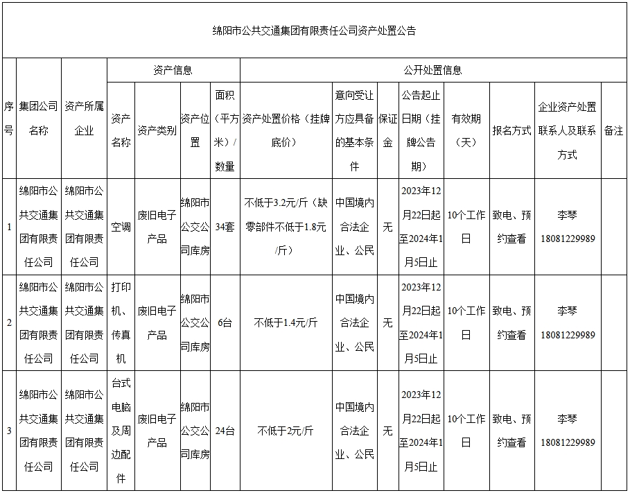 綿陽市公共交通集團有限責(zé)任公司資產(chǎn)處置公告
