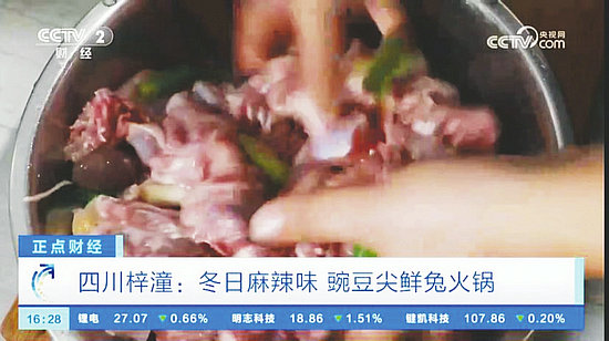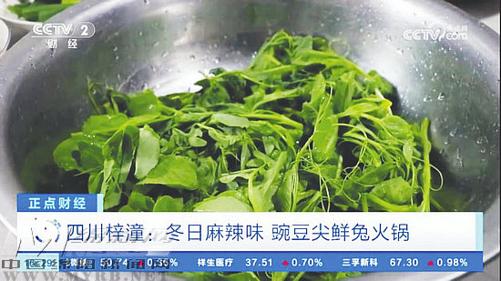 12月15日,央視CCTV2《正點財經(jīng)》將鏡頭再次對準綿陽梓潼冬日麻辣鮮香美食—豌豆尖鮮兔火鍋。報道稱,每到冬天的時候,梓潼縣的村民就喜歡將兔肉與當(dāng)季豌豆尖組合,做上一鍋麻辣鮮香的豌豆尖鮮兔火鍋,驅(qū)寒暖身。