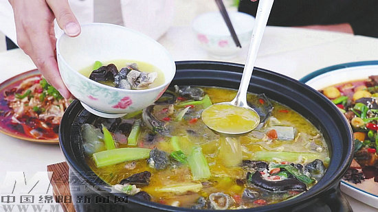 由于甲魚肉質(zhì)較嫩,要先將雞肉加入紅棗高壓鍋壓制20分鐘左右,再與甲魚一起放入砂鍋煲煮15分鐘,加入萵筍、木耳、枸杞,撒上胡椒粉,5分鐘后,一鍋原汁原味的甲魚雞湯就做好了。廚師還烹制了紅燒甲魚,和幾個小菜一起端上了餐桌。