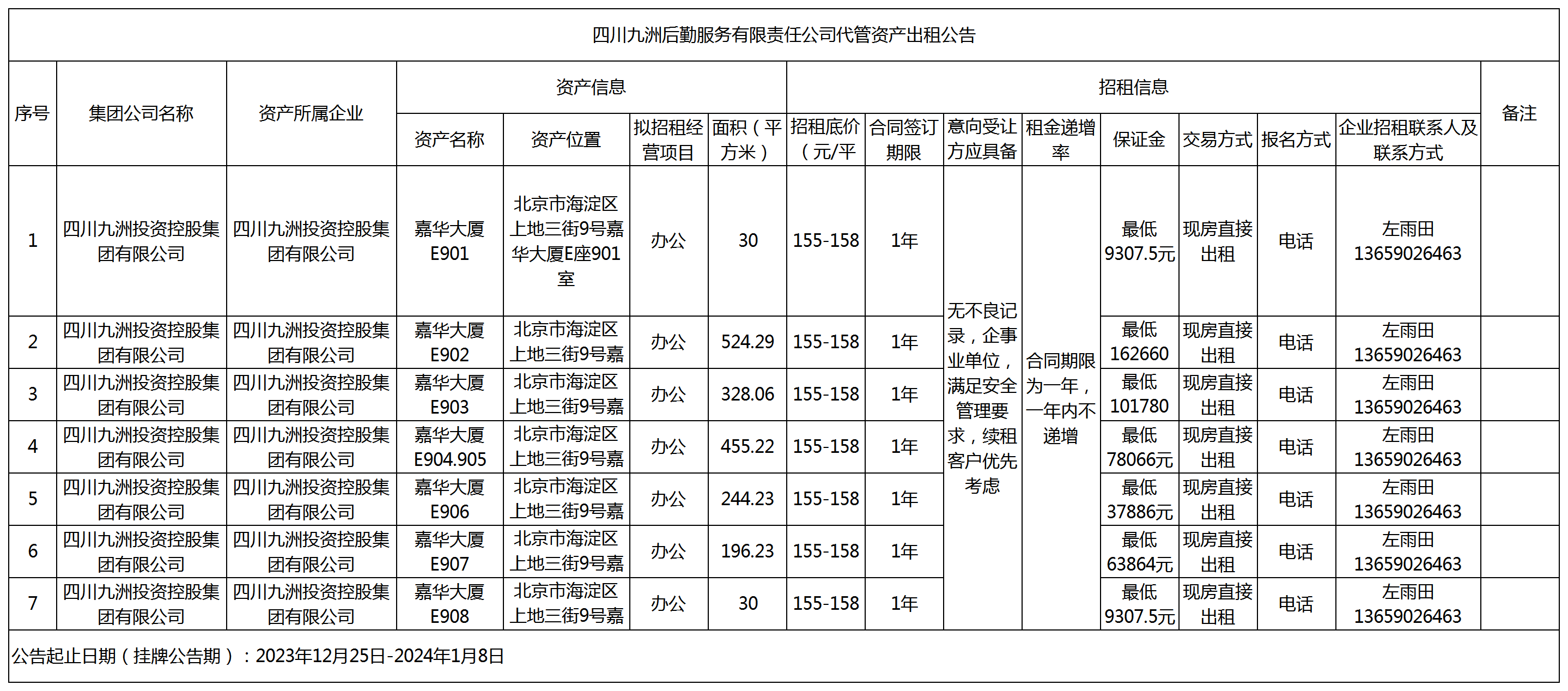 四川九洲后勤服務(wù)有限責(zé)任公司代管資產(chǎn)出租公告