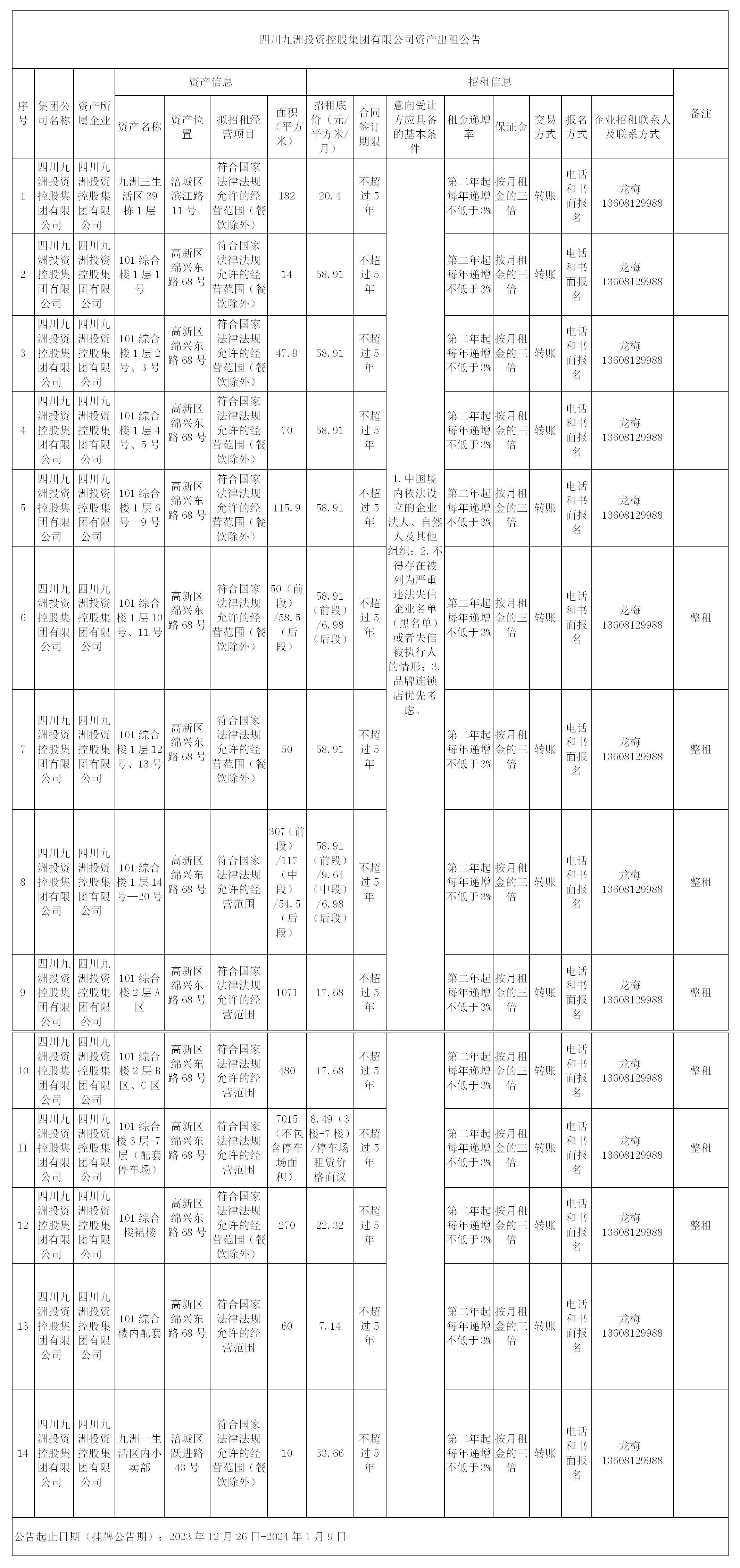 四川九洲投資控股集團(tuán)有限公司資產(chǎn)出租公告