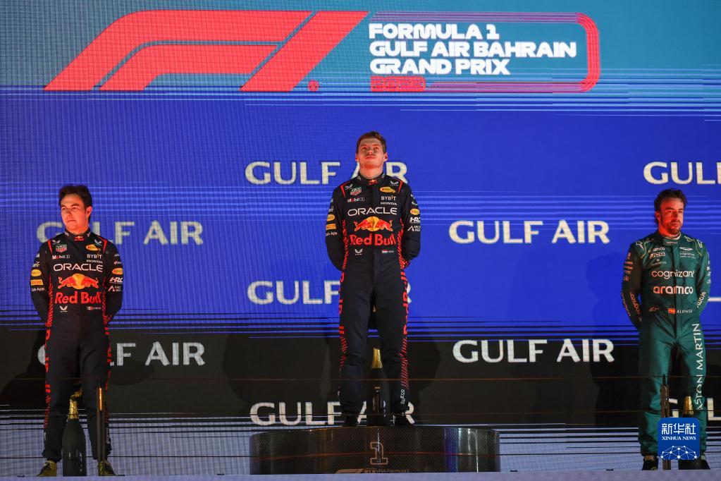 3月5日,紅牛車隊(duì)荷蘭車手維斯塔潘(中)、紅牛車隊(duì)墨西哥車手佩雷茲(左)和阿斯頓·馬丁車隊(duì)西班牙車手阿隆索在頒獎(jiǎng)儀式上。新華社發(fā)(錢俊攝)