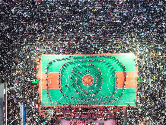 3月26日,比賽開始前,苗族同胞在首屆“美麗鄉(xiāng)村”籃球聯(lián)賽總決賽賽場上跳舞(無人機(jī)照片)。新華社記者 歐東衢 攝