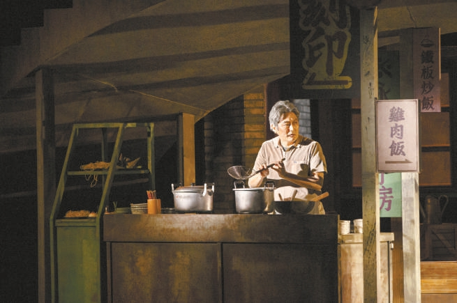一些細(xì)節(jié)上的藝術(shù)省略更見編導(dǎo)技巧。全劇有兩處令人印象深刻的漂亮的省略。一處是眷村老兵和家眷們夜色中“回家”。他們離開李金標(biāo)面店時(shí),李妻給每人一支蠟燭,告訴他們“別找不到回家的路”。顯然,這是一語雙關(guān),因?yàn)檫@些老兵都滿腹鄉(xiāng)愁,回大陸是他們心之所向。眾人手持蠟燭,小心而又艱難地拾級向上,當(dāng)他們都在上層表演區(qū)站定后,舞臺光轉(zhuǎn)暗,一排閃著紅光的蠟燭被定格——無言的前進(jìn)與明暗間的摸索是最好的表達(dá)。另一個(gè)細(xì)節(jié)是光啟如何將奶奶去世消息告訴爸爸的處理。當(dāng)光啟握著信失魂落魄、淚流滿面地出現(xiàn)在李金標(biāo)面前時(shí),臺上的李金標(biāo)和臺下的觀眾其實(shí)已預(yù)料到發(fā)生了什么。在李金標(biāo)的堅(jiān)決要求下,光啟緩緩展開信紙并舉起,但這封信并沒有被念出,而是代之以舞臺上急促、多重的心跳聲。這心跳聲既表達(dá)了劇中人的情緒情感,更產(chǎn)生了此時(shí)無聲勝有聲的審美效果。
