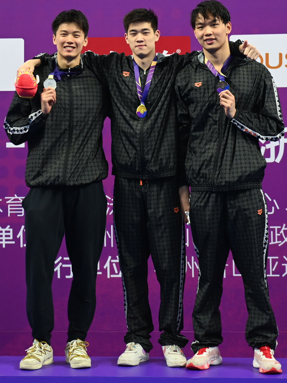 5月4日,分獲男子200米自由泳前三名的浙江隊(duì)選手潘展樂(中)、汪順(左)和洪金權(quán)在頒獎儀式上合影。新華社記者黃宗治攝