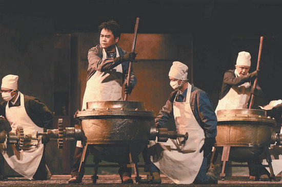 與歌劇跌宕的劇情相匹配,作曲家唐建平也創(chuàng)作了極具戲劇張力的音樂。全劇既有不少充滿挑戰(zhàn)的高音唱段,也有充滿“氛圍感”的旋律。221沒有合適的炸藥合成設(shè)備,工作人員就用人工土法攪拌,小危險不時發(fā)生,這時的音樂充滿懸疑感,緊扣心弦。唐建平還在劇中融入了當(dāng)?shù)匾魳吩兀习雸鲆魳酚刹刈迕窀枰?,下半場則由青海花兒開啟,而在劇中的聯(lián)歡會上,藏族風(fēng)格的音樂元素不時響起,也為梁振道與女友的意外相遇鋪墊了情緒。