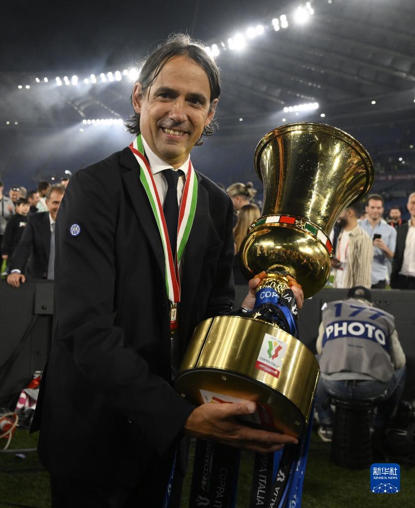 5月24日,國際米蘭隊主教練因扎吉在頒獎儀式上慶祝。新華社發(fā)(奧古斯托·卡薩索利攝)