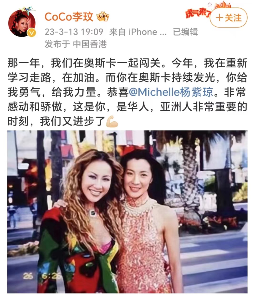 3月13日,李玟更新微博,恭賀楊紫瓊獲奧斯卡金像獎,成為首位華裔影后。
