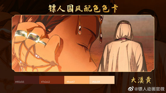 從畫面來看,制作團隊為動畫特意設計的殘陽紅、大漠黃、刀鋒墨、墨染朱等六套專屬色卡,被廣大動畫迷們所喜愛,一如網(wǎng)友評價提及的那樣“中式復古的紅、幽靜深沉的藍還有體現(xiàn)了大漠風情的配色,在審美這點上,《鏢人》真的絕了”。大膽啟用的高飽和度色調(diào)更是凸顯了團隊在畫面構建及色彩應用上力求品質(zhì)與極致的雙重加持。