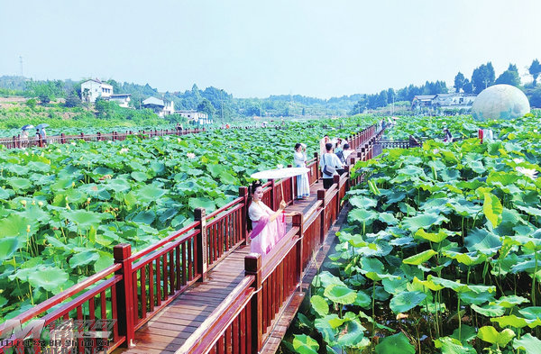 涪城區(qū)吳家鎮(zhèn)“湖光山色”稻漁親水濕地農(nóng)業(yè)主題公園內(nèi)荷花盛開,游人紛至沓來。