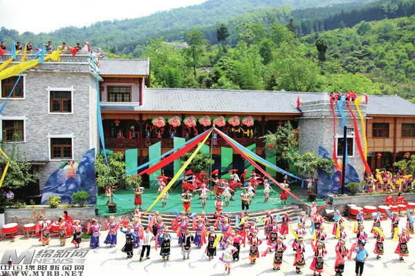 在石椅羌寨,群眾伴著歡快的音樂(lè)載歌載舞。