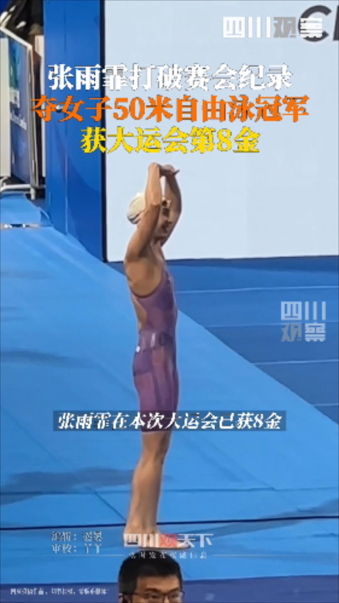 8月7日,成都大運會女子50米自由泳項目決賽在東安湖體育公園游泳跳水館舉行,中國隊員張雨霏以24.29秒的成績奪得金牌,并打破世界大學(xué)生運動會該項目的紀錄,這也是張雨霏在本屆大運會的第8金。