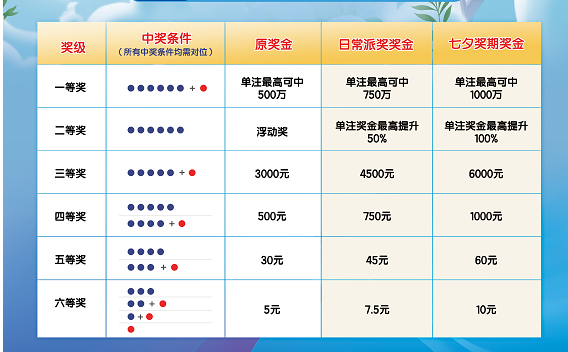 一等獎(jiǎng)派獎(jiǎng)總獎(jiǎng)金1750萬(wàn),其中500萬(wàn)元專項(xiàng)用于七夕特別獎(jiǎng)期,由符合條件且中得一等獎(jiǎng)的彩票按中獎(jiǎng)注數(shù)均分。二等獎(jiǎng)派獎(jiǎng)總獎(jiǎng)金200萬(wàn)元,其中50萬(wàn)元專項(xiàng)用于七夕特別獎(jiǎng)期,由符合條件且中得二等獎(jiǎng)的彩票按中獎(jiǎng)注數(shù)均分。固定獎(jiǎng)派獎(jiǎng)總獎(jiǎng)金3500萬(wàn)元,其中500萬(wàn)元專項(xiàng)用于七夕特別獎(jiǎng)期,由符合條件且中得三至六等獎(jiǎng)中任意獎(jiǎng)級(jí)的彩票同時(shí)中得派獎(jiǎng)獎(jiǎng)金。七夕特別獎(jiǎng)期外單注獎(jiǎng)金最高提升50%,七夕特別獎(jiǎng)期單注獎(jiǎng)金最高可翻倍!活動(dòng)期間,單票單期滿10元可參與(符合參與條件的多期票、套票、預(yù)售票按期參與)。