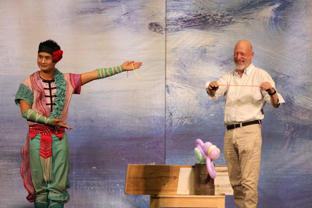 9月3日,在西班牙馬德里EDP格蘭維亞劇院,演員與觀(guān)眾互動(dòng)。新華社記者 孟鼎博 攝