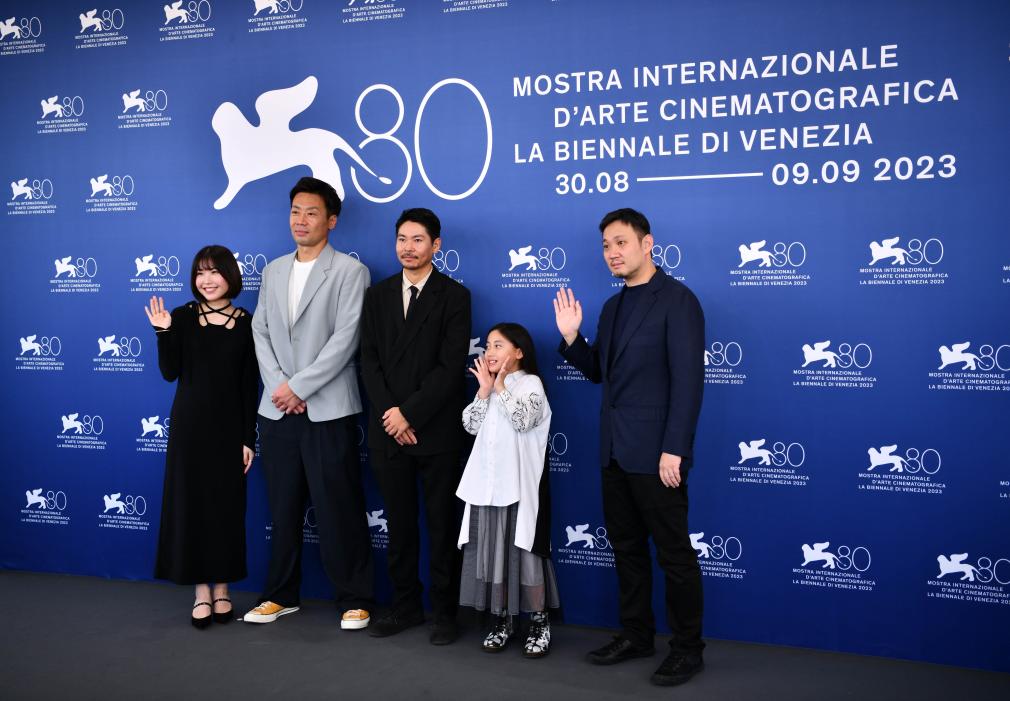 9月4日,電影《邪惡不存在》導(dǎo)演濱口龍介(右二)攜主創(chuàng)人員出席意大利威尼斯電影節(jié)拍照式。新華社記者 金馬夢妮 攝