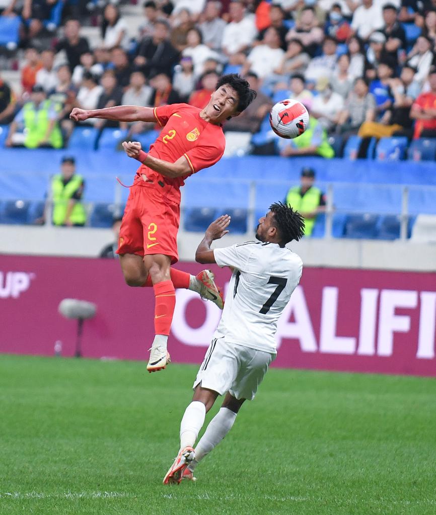 9月6日,中國隊球員胡荷韜(左)在比賽中爭頂。新華社記者 龍雷 攝