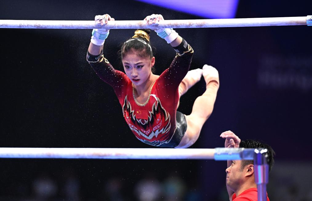 9月25日,中國隊(duì)選手左彤在高低杠項(xiàng)目中。新華社記者 程敏 攝