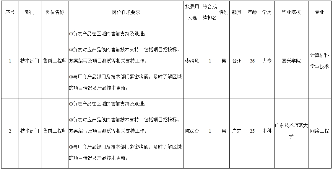 根據(jù)四川長(zhǎng)虹佳華信息產(chǎn)品有限責(zé)任公司發(fā)布的招聘公告及招聘相關(guān)規(guī)定,經(jīng)筆試、面試、考察、體檢等程序,擬錄用李清風(fēng)、陳法奮同志到四川長(zhǎng)虹佳華信息產(chǎn)品有限責(zé)任公司工作,現(xiàn)予以公示,具體情況如下: