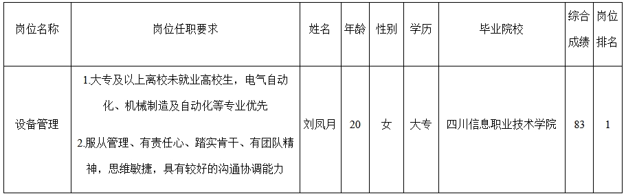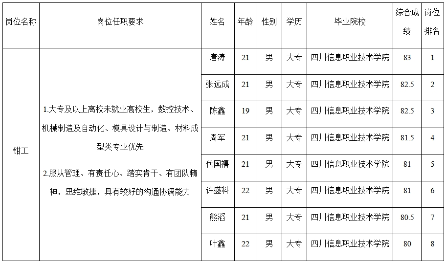 根據(jù)四川長(zhǎng)虹技佳精工有限公司發(fā)布的招聘公告及招聘相關(guān)規(guī)定,經(jīng)資格審查、面試等程序,現(xiàn)將測(cè)試合格人員予以公示。