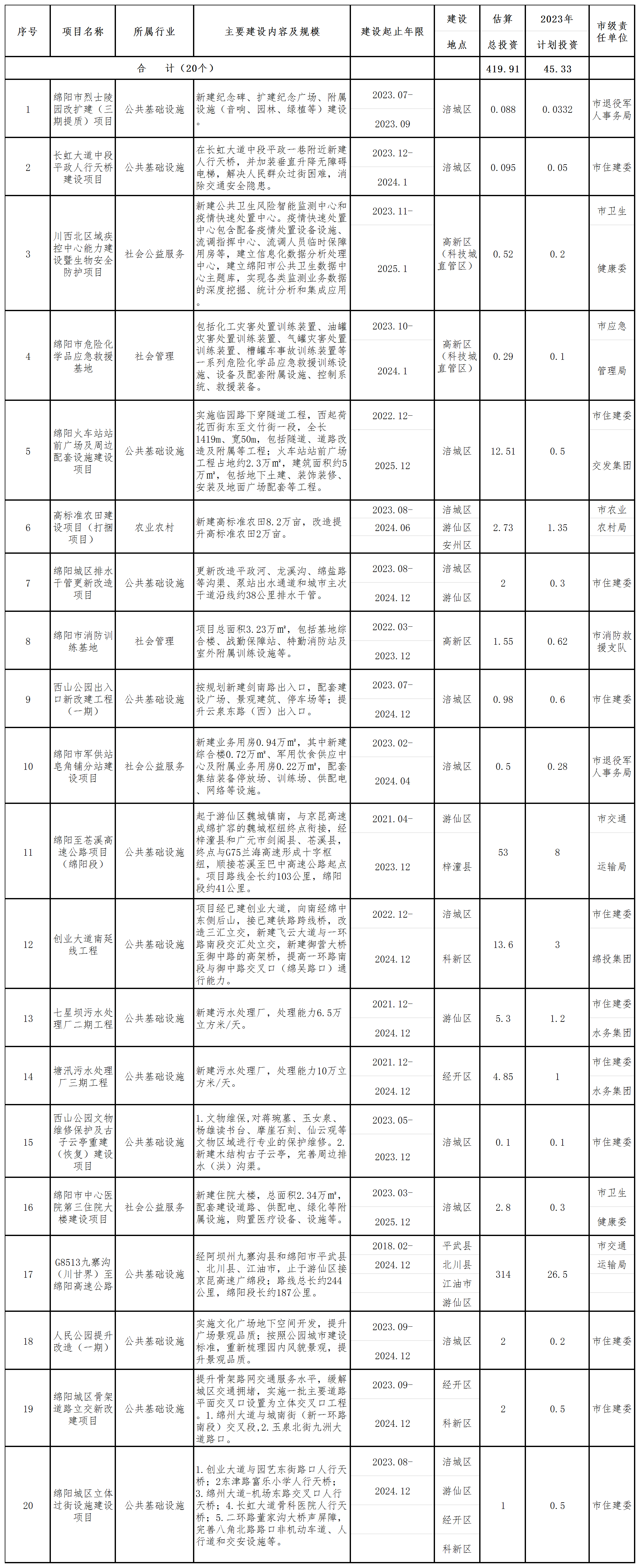 2023年12月27日,綿陽(yáng)市八屆人大常委會(huì)第二十次會(huì)議審議并通過(guò)了《綿陽(yáng)市人民政府關(guān)于2023年度市本級(jí)政府投資項(xiàng)目計(jì)劃調(diào)整方案的報(bào)告》,2023年市本級(jí)政府投資項(xiàng)目共20個(gè),計(jì)劃總投資419.91億元,年度計(jì)劃投資45.33億元。