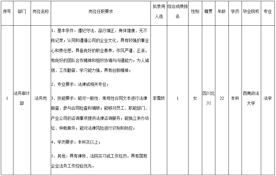 根據(jù)四川九洲投資控股集團有限公司發(fā)布的招聘公告及招聘相關(guān)規(guī)定,經(jīng)筆試、面試、考察、體檢等程序,擬錄用李雪嬌同志到四川九洲投資控股集團有限公司工作,現(xiàn)予以公示,具體情況如下: