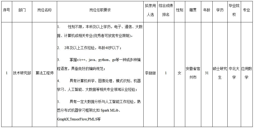 根據(jù)四川虹美智能科技有限公司發(fā)布的招聘公告及招聘相關(guān)規(guī)定,經(jīng)筆試、面試、考察、體檢等程序,擬錄用李甜甜同志到公司工作,現(xiàn)予以公示,具體情況如下: