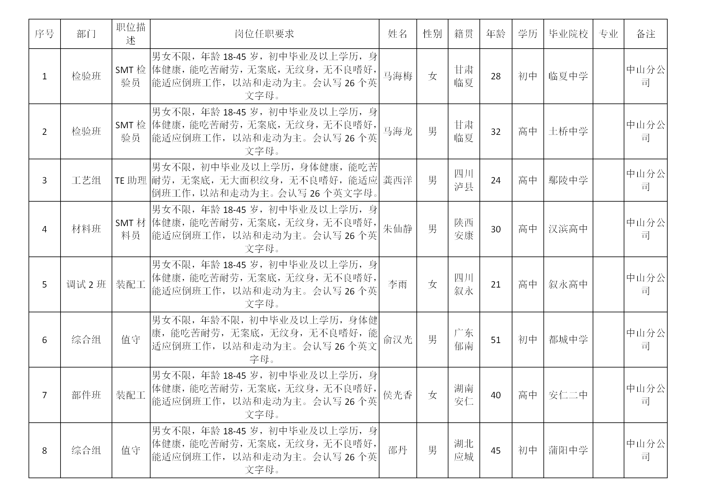 根據(jù)四川長(zhǎng)虹精密電子科技有限公司發(fā)布的操作職招聘公告及招聘相關(guān)規(guī)定,從2023年12月1日至2023年12月31日經(jīng)面試、考察、體檢等程序,錄用以下8位同志到四川長(zhǎng)虹精密電子科技有限公司操作職崗位工作,現(xiàn)予以公示,具體情況如下: