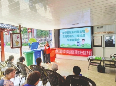 “枧·愛”新時(shí)代文明實(shí)踐站志愿者在新華社區(qū)向群眾宣傳垃圾分類、環(huán)境治理。